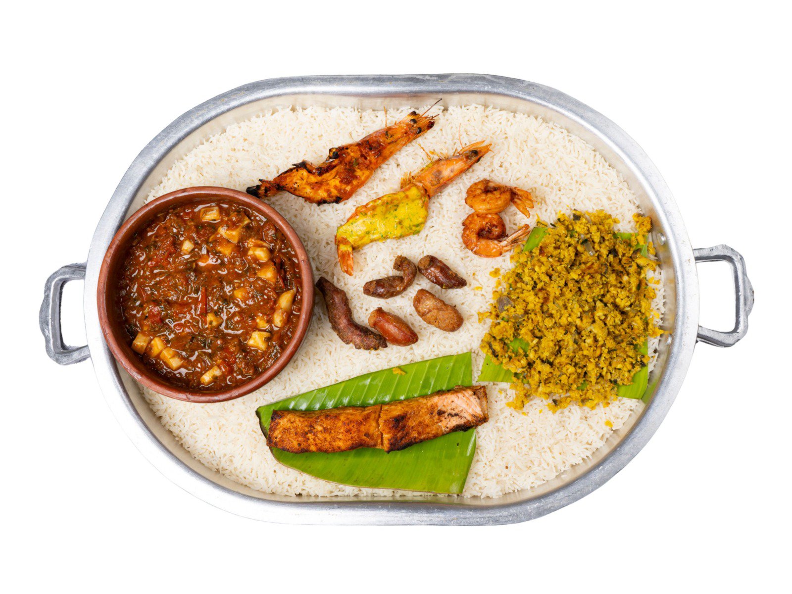 حمسة نغر 1، جشيد 1، روبيان مشوي ومقلي 4، سالمون 1، حبول 3، رز أبيض، دقوس، دهن وصوص