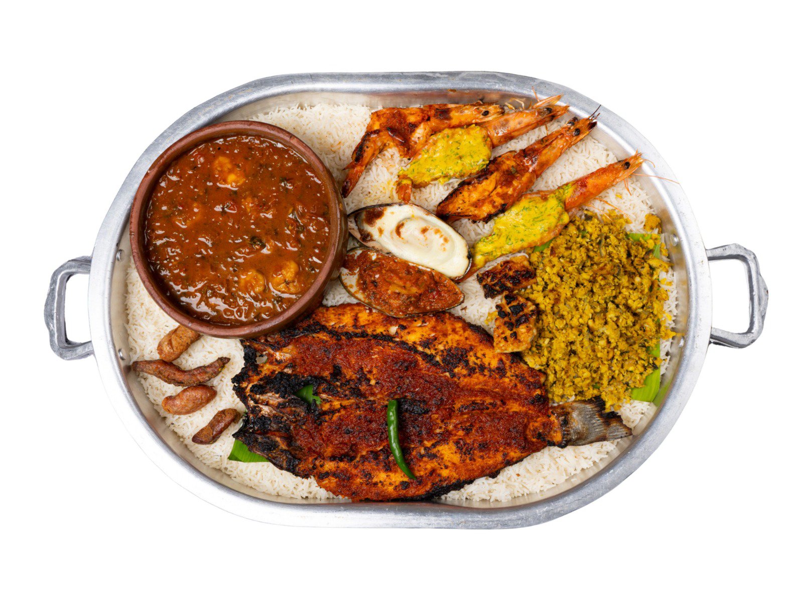 سيباس 1، حمسة روبيان 1، روبيان 4، محار 2، نغر 2، حبول 2، نوعين رز، سلطة عربي، دقوس ودهن